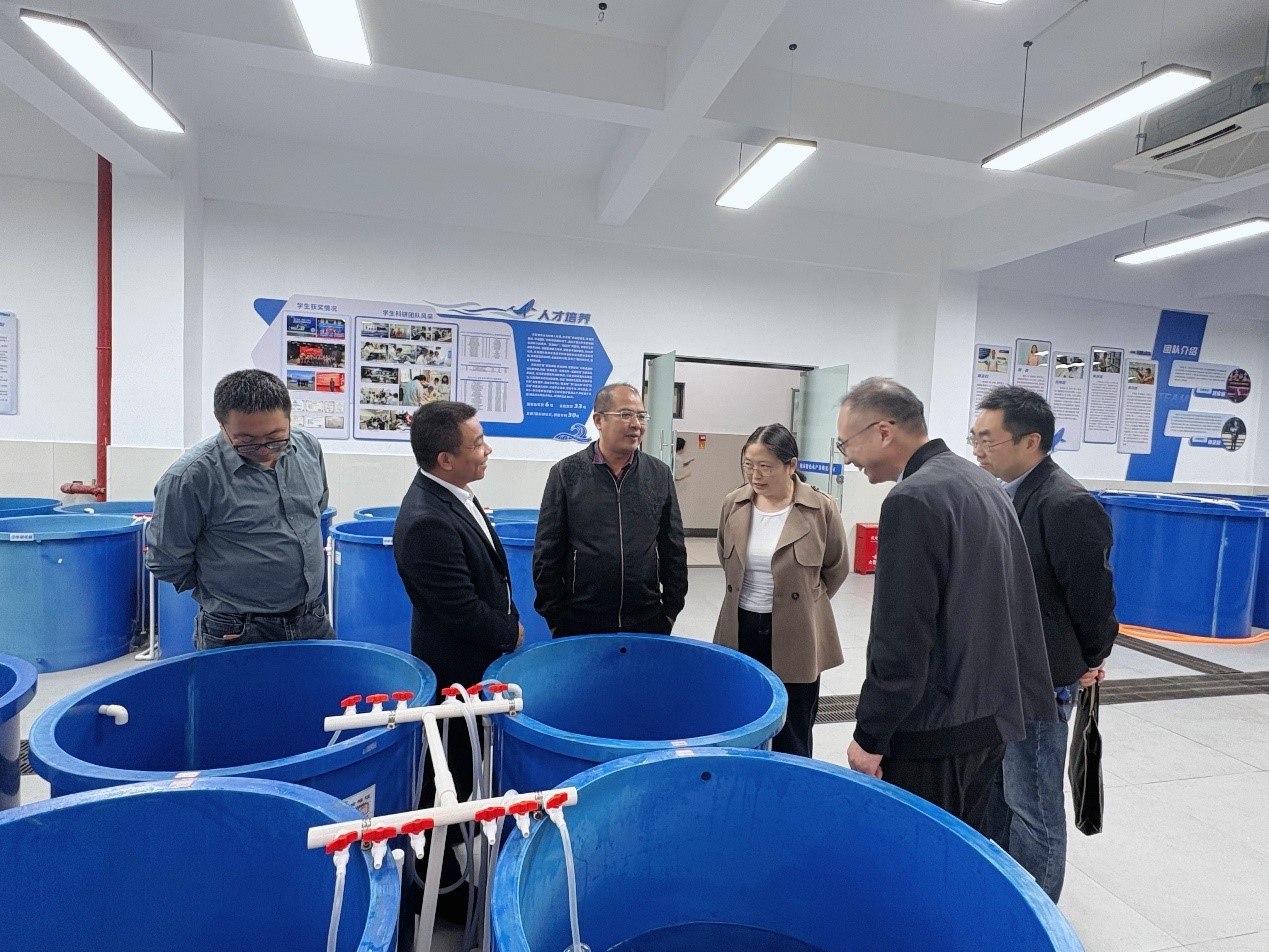 授牌结束后,郭正武详细介绍了Beat365官方网站水产实训中心的建设与运行情况。该中心配备标准化育苗池、循环水养殖系统及工厂化循环水养殖盒等设施,可开展水产动物繁养、水质调控、苗种培育等全链条实践教学,已累计承担多项水产养殖专业实习实训任务。在郭正武的引导下,季永良一行实地参观了实训车间,重点了解了中心在大黄鱼繁育、拟穴青蟹和海参工厂化养殖等技术领域的实践成果,对中心“理论与实操深度融合”的建设理念给予高度评价。