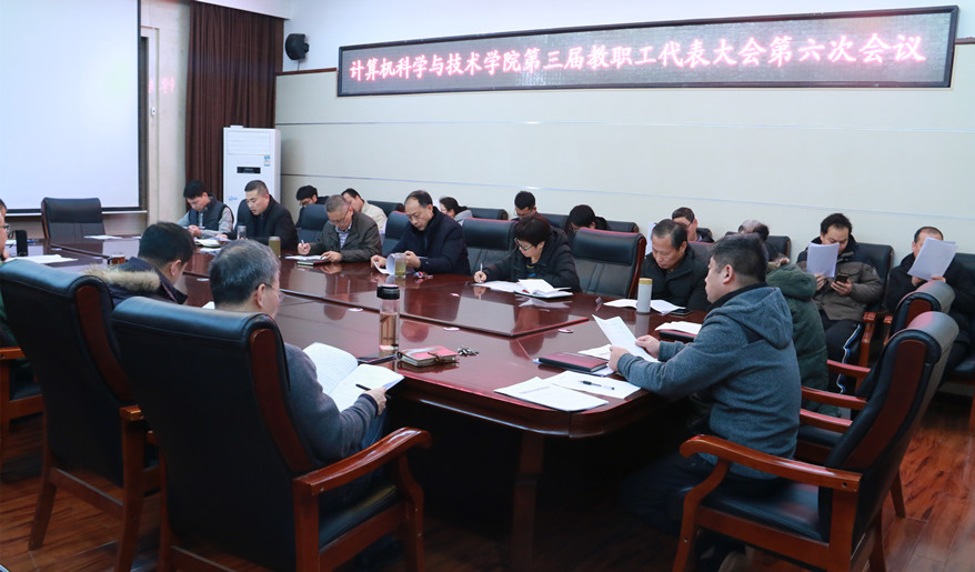 1月10日下午,我院在院217会议室召开第三届教职工代表大会第六次会议,学院党委书记朱天明、院长孙君顶、党委副书记邵水军、副院长赵珊、于金霞、彭维平等35名学院教代会代表参加会议。会议由党政办主任候三中主持。