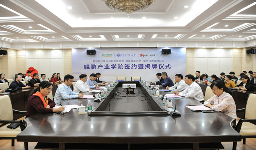 永利集团官网院长孙君顶与黄河科技集团创新有限公司董事长冯武分别代表校企双方签署鲲鹏产业学院共建协议,刁玉华、佀洪恩、杨小林、赵俊伟、沈记全等领导见签。