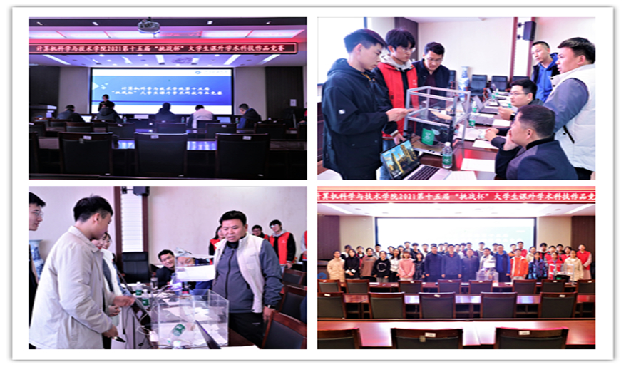 在主持人郝沛瑶为参赛队伍以及观赛人员介绍本次比赛答辩规则及流程后,比赛正式开始。此次院赛参赛队伍共有34支,其中科技发明制作类20支,哲学社会科学类14支。作品涉及哲学社会科学社会调查报告和学术论文、科技发明制作。每支队伍的项目负责人按照抽签顺序依次上台讲解参赛项目,展示完成后由评委老师根据选手表现提出问题以及建议,选手进行答辩。评审开始前,各位评委参考大赛的评审标准选定了评判原则和方案。随后,各参赛团队依次上台对自己的作品进行讲解展示,本次答辩采用“陈述展示+现场问答”的形式进行,他们用简洁精炼的语言和严谨科学的思路从作品背景、研究思路、作品原理、项目特点等多方面向评委老师们展示自己的作品。在介绍过程中,评审老师根据项目介绍、申报书内容细节和展示情况对各项目的创新点、先进性、研究进展和展示效果等方面提出了疑问并给出了改进建议。本次竞赛评审团帮助同学们解决了许多作品存在的问题,并使同学们受到很多启发,为以后的竞赛提供了宝贵的经验。