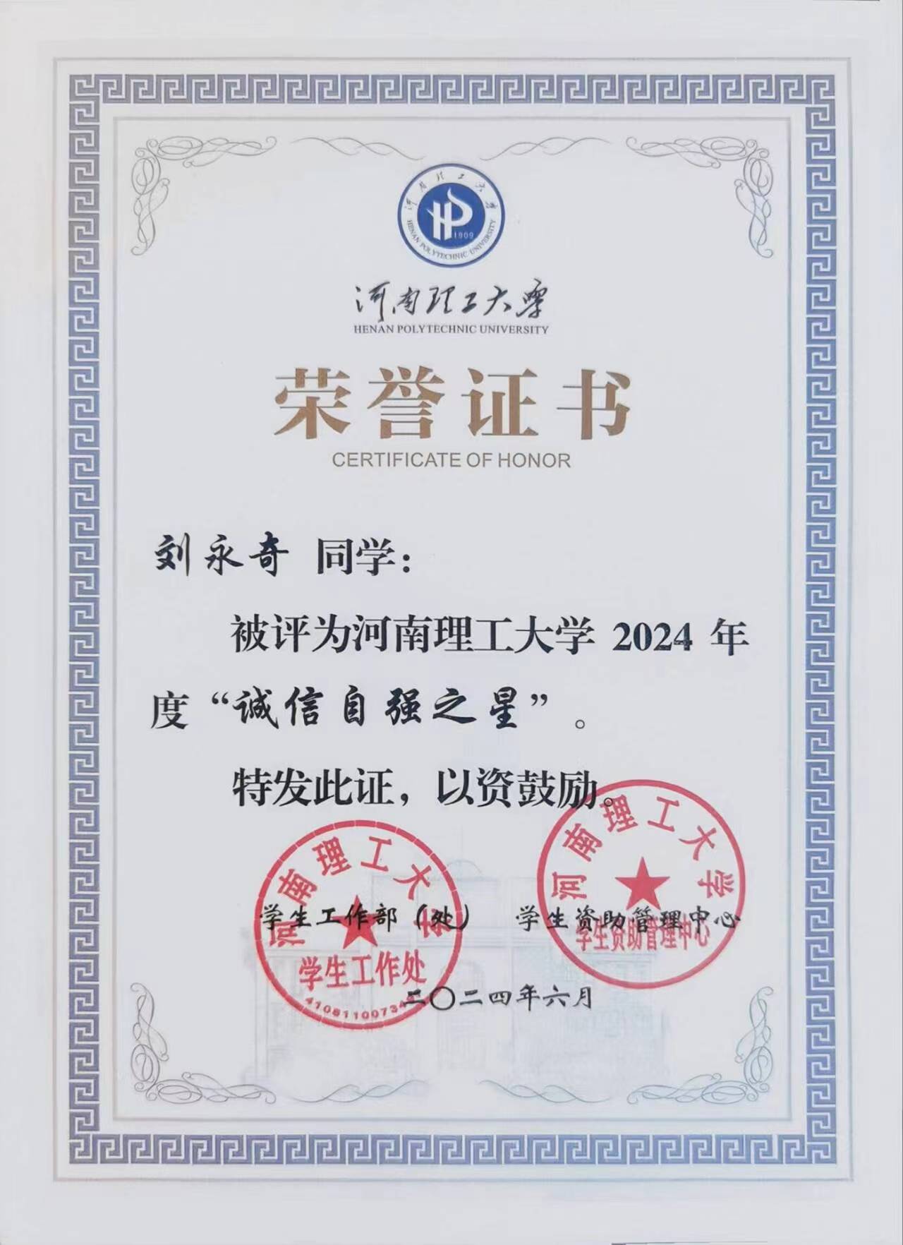 为增强大学生的诚信意识和责任意识,弘扬诚实守信、自强自立、感恩奉献的优良品质,鼓励受助学生励志成才、诚信还贷,近期,学校组织开展了2024年度“诚信自强之星”评选活动。我院2020级软件工程专业本科生刘永奇获得3044永利集团2024年度“诚信自强之星”称号。