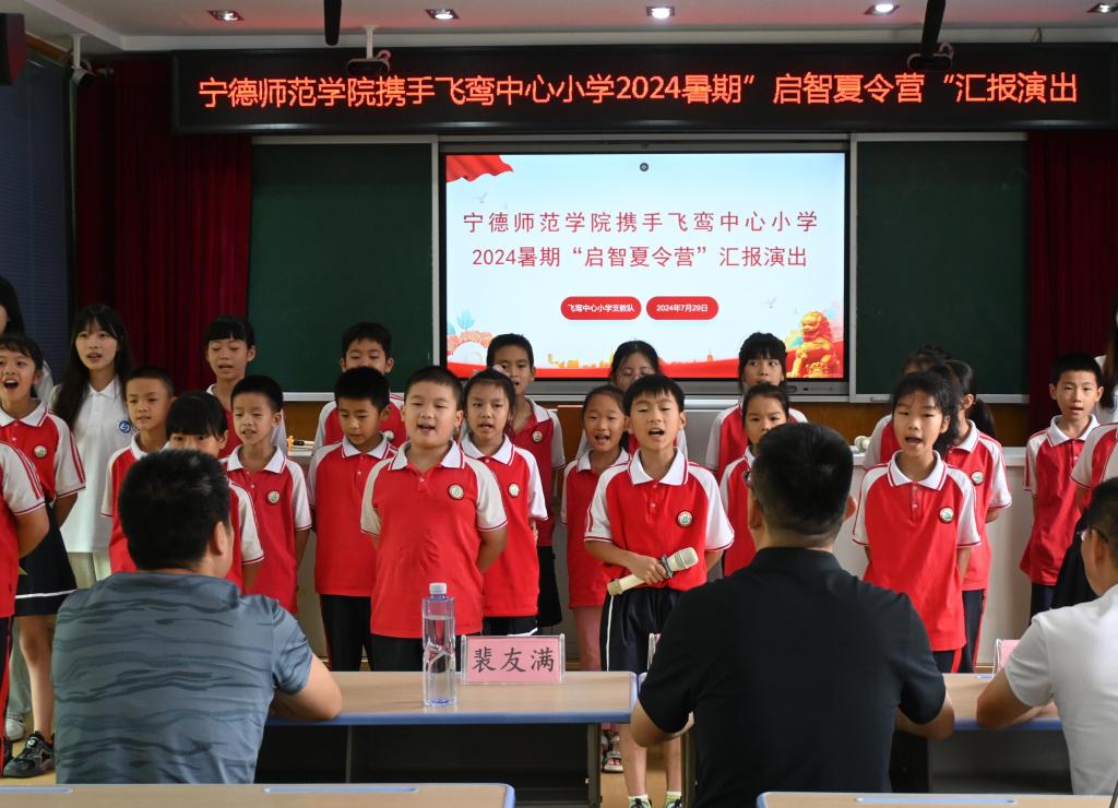7月29日,宁德市飞鸾中心小学录播室内充斥着孩子们的欢声笑语,荧幕上播放着相处时的点点滴滴,在充满温度和不舍的旋律中,为期两周的启智夏令营在精彩的文艺汇演中落下帷幕。从《歌唱祖国》的深深爱国情怀到《不完美小孩》的温馨感动,孩子们用稚嫩的声音诠释着“向阳而生”的精神内涵,用欢快的舞步表达着“欢声未来”的无限憧憬和追求,每个节目都凝聚了支教队成员们与孩子们的心血和汗水。这个夏天,支教队员共同见证了孩子们的成长,为乡村教育振兴事业贡献了一份青春力量。
