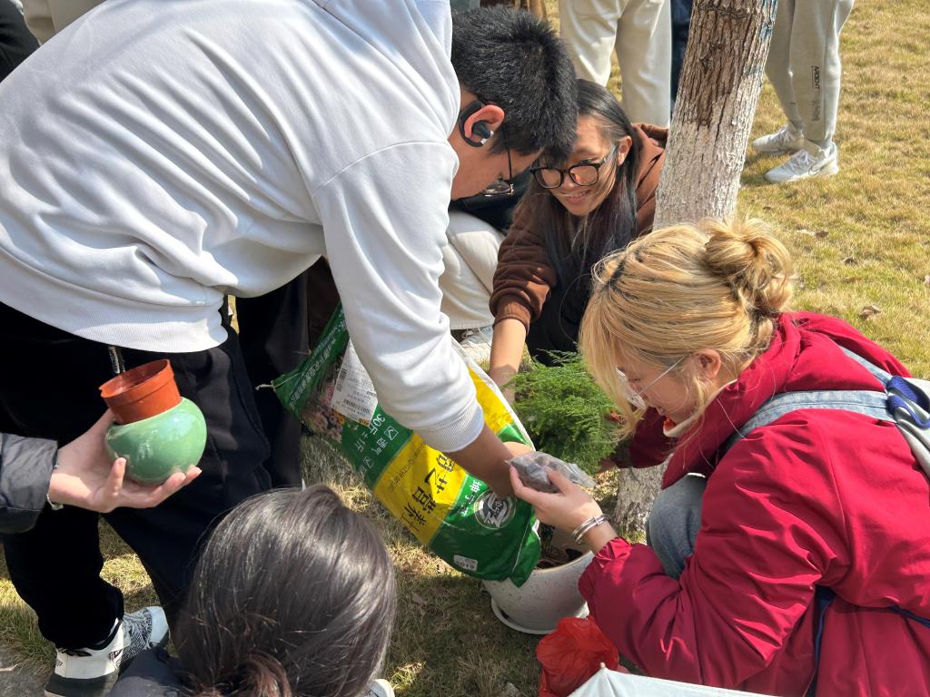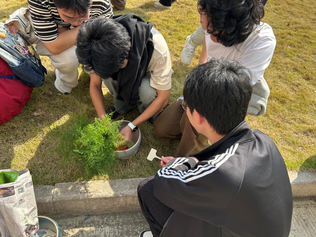 活动当日,阳光暖煦,微风不燥,正是植树好时节。参与者们满怀热忱,准时在Beat365官方网站院楼下集合。实践部的工作人员早已忙碌完毕,植树工具整齐排列,各类植物生机勃勃,静静等待着开启这场绿色之旅,现场氛围有序而热烈。本次活动精心购置了12株寓意美好的植物,涵盖了绣球、文竹等,每株植物由3 - 5人自由组队进行种植,大家迅速寻找队友,组建起“绿色小团队”,为即将开始的种植工作摩拳擦掌。植树活动正式开始,同学们默契配合,现场一派热火朝天的劳动景象。在劳作过程中,同学们还交流起植树技巧与环保心得,欢笑声、讨论声交织在一起,奏响了一曲欢快的春日劳动乐章。