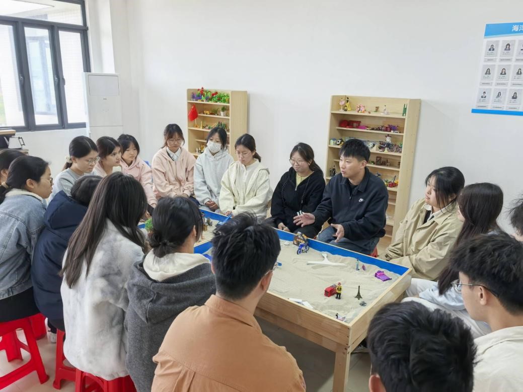 活动开始,指导老师林维杰为同学们设定主题,大家自由选取沙具,在沙箱中构建属于自己的“心灵花园”,将无形思绪转化为有形图景。随着沙盘场景逐渐成形,同学们在静默创作中实现了情绪宣泄与压力疏导。通过观察与反思自己创造的沙盘世界,大家对自身的认知模式与内在需求有了更深入的觉察。随后,同学们分享创作感悟,在真诚交流中获得新的视角与启发。最后,老师为同学们进行分析总结。整场活动在专业、包容的氛围中展开,有效助力同学们整合内心矛盾,重建心理平衡。活动结束后,同学们纷纷表示,这种独特的表达方式让自己能更直观地触碰并理解深层情感,获得了别样的放松与启迪。