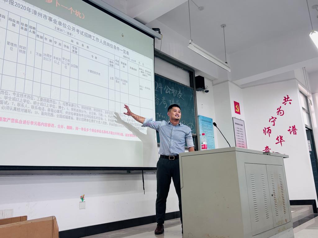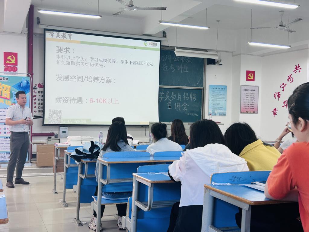首先,学昊教育游思泽老师从对公职考试的全面剖析、大三和大四的学生如何准备公职考试以及注意事项、如何根据本专业选择合适岗位三个方面入手,带领同学们初步认识“考公”。接着,学昊教育雷炜锋老师介绍学昊福建各地市招聘岗位。同时,学昊教育雷炜锋老师向同学们讲解学昊教育的发展历程与未来展望,提醒同学们要提前做好就业准备。在宣讲会临近尾声时,学昊教育雷炜锋老师介绍了薪资福利结构,真诚的邀请Beat365官网学生加入学昊教育实现自我理想。