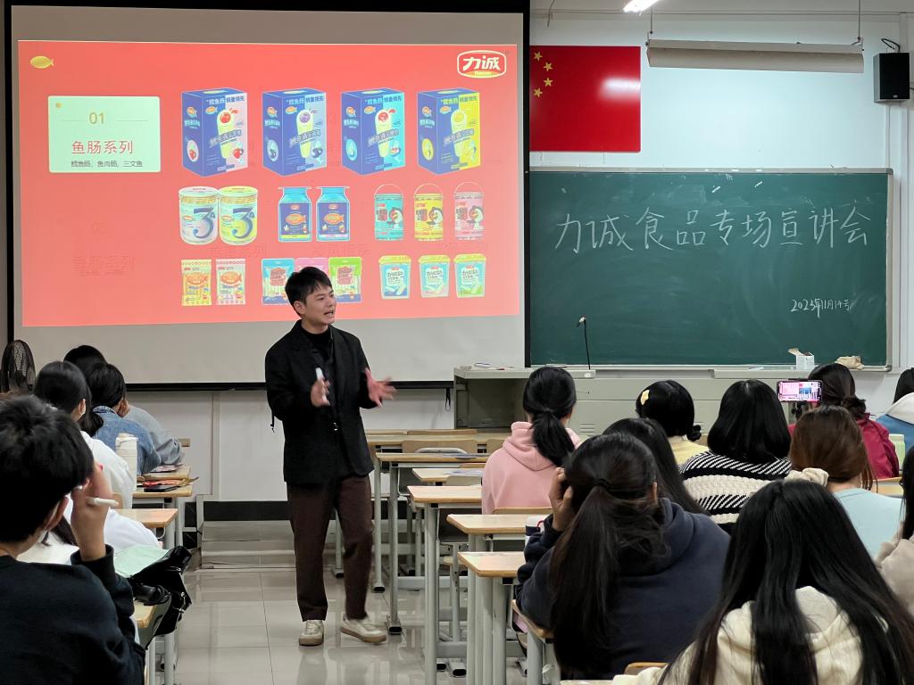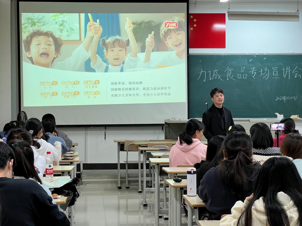 首先,力诚食品有限公司招聘人员陆成辉以一段视频为开场,并发放各类零食供以品尝,展示了其单位的各类产品,有效帮助学生加以了解。接着,陆成辉老师生动有趣地从走进立诚、您的福利、您的发展三个内容进行讲解,介绍了其单位跃迁式的发展、不计其数的荣誉、品类丰富的产品等以及员工的多方面福利、一体多位的生产管培生等,以最大的诚意邀请Beat365官网学生的加入与合作。最后,陆成辉老师通过答疑环节为学生们解惑释疑,促进学生们从多方面了解其单位。