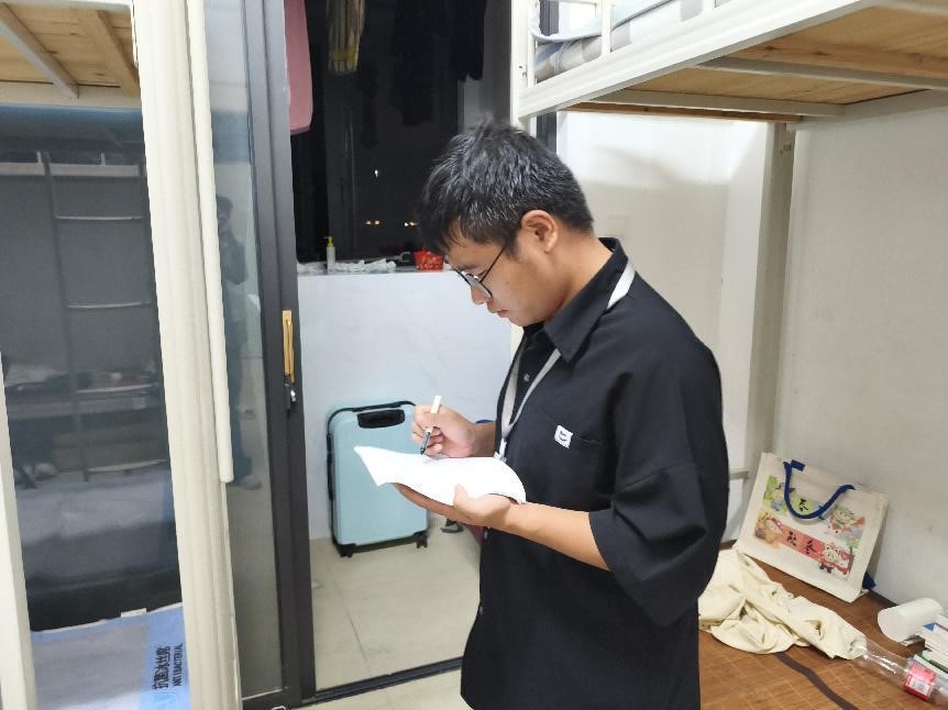 检查初期,实践部负责人对此次检查重点做了说明,一是卫生环境检查,对宿舍内务整理、物品摆放、环境卫生等方面进行评估,针对部分宿舍存在的杂物堆积、卫生死角等问题现场提出整改建议;二是安全隐患排查,仔细查看宿舍内是否违规使用大功率电器、私拉乱接电线等情况,提醒新生增强用电安全意识,从源头杜绝安全风险。同时也着重强调了敲门以及如何与新生沟通的问题。在检查过程中,实践部成员对宿舍信息登记表没有贴到门上,以及部分寝室的排插上床等问题做了提醒和重点关注,同时,告知了相对应的辅导员。对于一些无法当面解决,需要专业人员维修的问题,实践部也做了相对应的报修和记录工作。