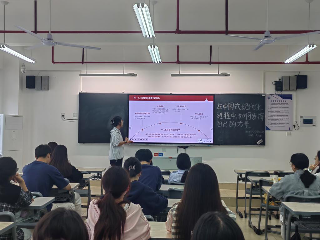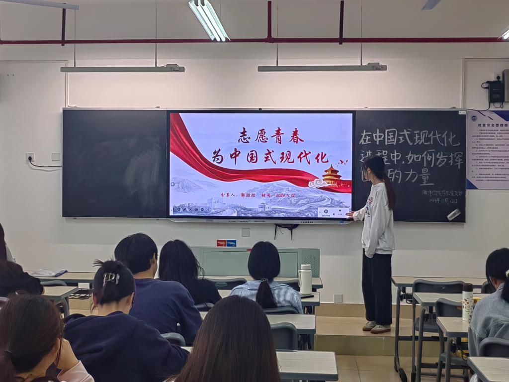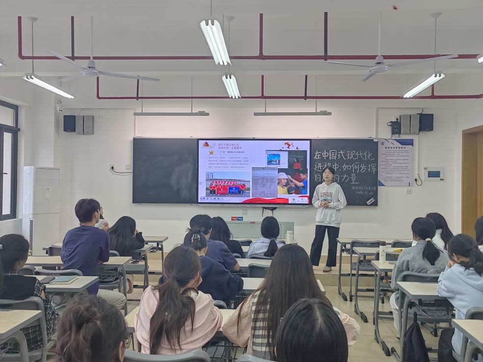 分享会上,张慧萍、郭湉湉、吴艺华、何丽贞、叶巧辉、高逸萱六位同学依次上台从对中国式现代化的理解、践行中国式现代化的具体行动以及青年们该如何做三方面的内容展开分享。其中,张慧萍立足学生干部经历,分享自己从被动接受任务到主动思考为为班级建设出谋划策的想法转变,激励与会青年积极适应和参与中国式现代化的进程,为实现国家的长远发展目标贡献自己的力量;郭湉湉以志愿青春为中国式现代化发挥自身力量为分享内容,讲述了在飞鸾镇中心小学的支教故事,鼓舞在座青年积极参与社会实践志愿服务,创新志愿服务形式,助力中国式现代化建设;吴艺华通过分享自己暑假助教的经历,领悟“用心做教育,用爱暖童心”的责任担当。她说,以挺膺“青春之姿”,奔赴“新征程”是她本次分享会主题的回答。