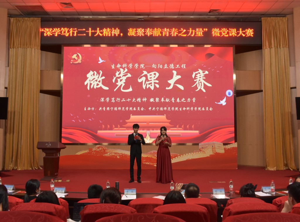 为深入学习宣传贯彻党的二十大精神,不断推动习近平新时代中国特色社会主义思想主题教育在青年学生中走深走实,以讲学、比学、展学形式,引导青年以时不我待的历史责任感强化自身素质,在推进中国式现代化的道路上施展抱负、建功立业,绽放绚丽的青春之花。6月6日晚,由宁德师范学院生命科学学院与共青团宁德师范学院委员会共同举办的“深学笃行二十大精神,凝聚奉献青春之力量”微党课大赛决赛在图书馆报告厅圆满举办。此次比赛共有32组选手参赛,经过初赛阶段的角逐,最终12组选手入围决赛。