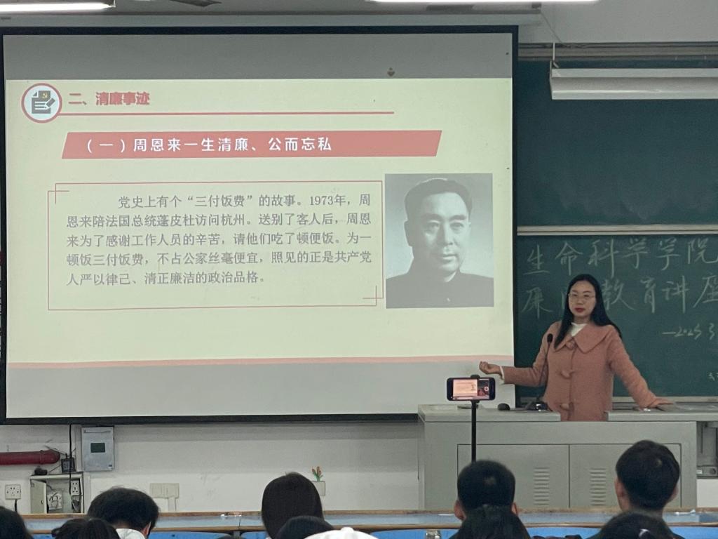 此次讲座由Beat365官网学生第二党支部书记李卓霖为主讲人,从严守政治纪律和政治规矩和先辈们的清廉事迹这两个板块向同学们做《扣好廉洁的第一粒扣子》报告。她指出严守政治纪律和政治规矩的重大现实意义,介绍了一生清廉、公而忘私的方志敏和周恩来,以及廉政榜样的潘东升,同时引入了腐败贪污的相关案例,为同学们深入的讲解和劝诫,最后向同学们讲述了培养廉洁意识和加强廉洁教育的重要性。